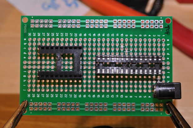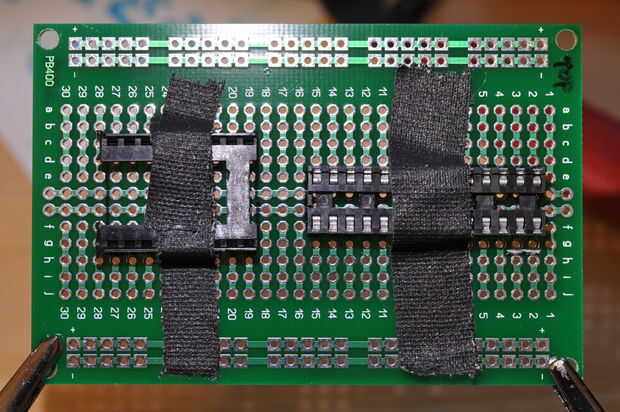 De la soldadura en los zócalos. Ayuda a la junta con cinta adhesiva. Cinta de iluminadores funciona mejor. Nota que no tengo un zócalo de 28 pines usé dos conectores de 14 pines end-to-end.