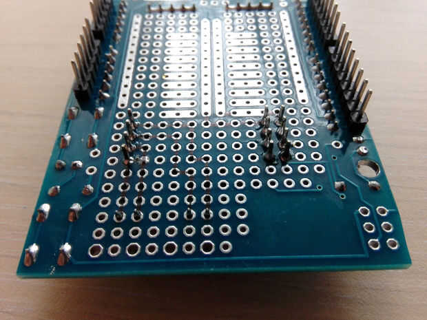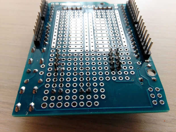 1. Use un marcador para dibujar el trazado fueron recorreremos nuestras líneas de señal de la Junta a los terminales de tornillo. Dibujar las líneas como se muestra en la primera imagen. Esto nos ayudará durante la soldadura. Notar que también hay 2 líneas que conectan el VCC y el GND de la ProtoShield a la Junta Directiva de la ADC!