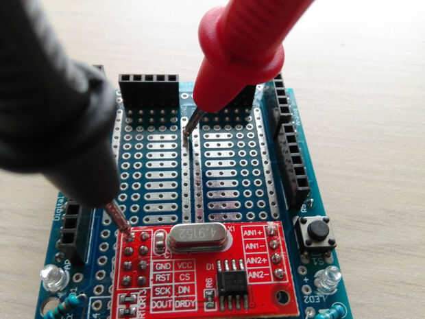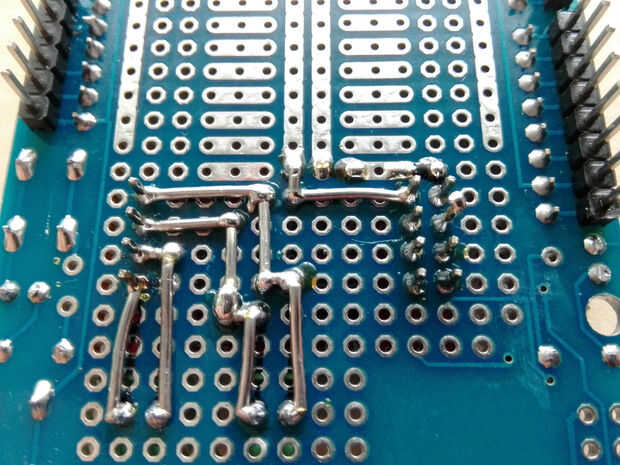 Antes de que salimos para soldar con alambres real, necesitamos conectar el tablero de ADC para líneas de alta tensión. Hay dos: GND y VCC (es decir, + 5V). Lo bueno de este ProtoShield es que tiene disponibles muy cerca de nuestros pins de alimentación ADC.
