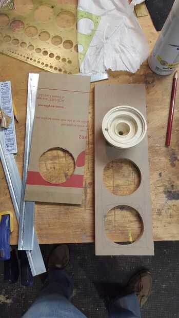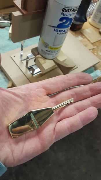 La forma triangular básica con una sierra de banda, disco lijar los lados y perfore un orificio piloto de 1/4 en el final a recceive la barra de latón.