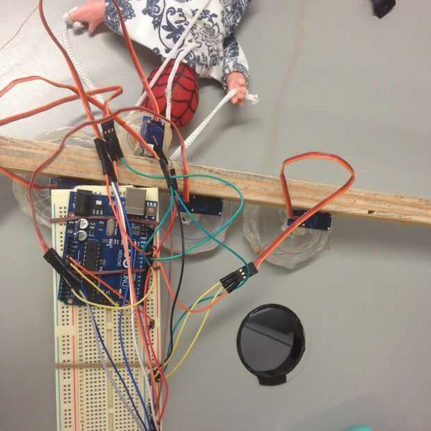 Con los Servomotores e hilos logramos hacer la polea jalara los hilos y le diera movimiento al títere.
