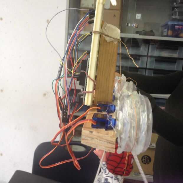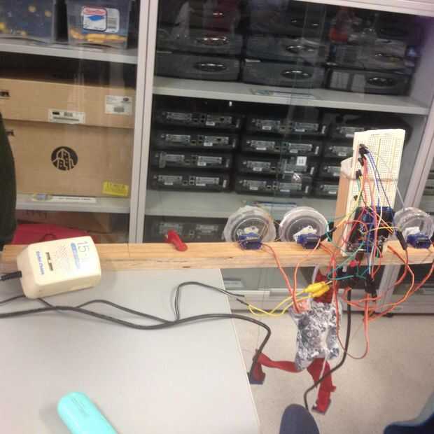 Alineamos los Servos de tal manera los hilos no se enredaran y se pudiera hacer el cableado pecado interferir con el títere y su movimiento, todo sobre una viga de madera.