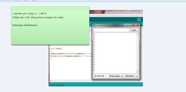lo hiciste!!! un paso más, subir código y ejecutarlo, haga clic en Monitor de la serie o pueden (Tools -> Serial Monitor o Ctrl + Mayús + M) aparecerán los datos del sensor