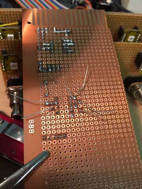 Los circuitos de interfaz MIDI utilizados en la prueba de concepto deben ensamblarse a un montaje en circuito impreso. Asaltaron una vez más, el cubo de piezas para algunas Junta de proyecto. Este tablero también figura el circuito comparador utilizado para aislar los pedales de expresión y fácilmente montado sobre el enrejado de madera.