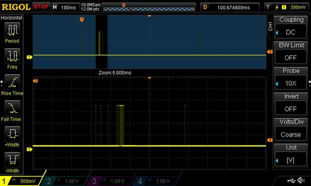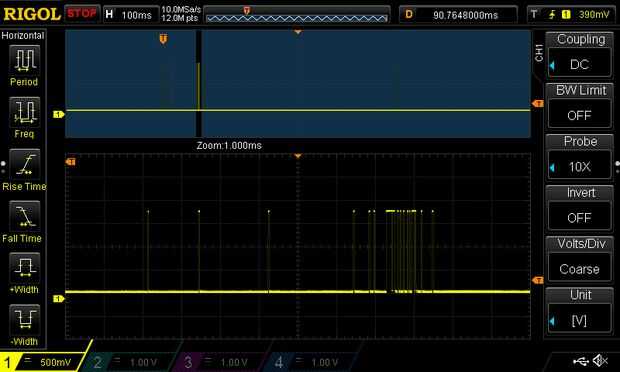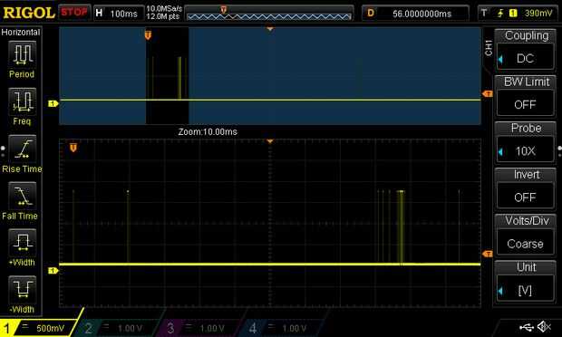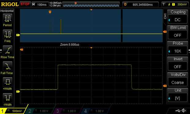 Muestra el evento 1 y 2. Los que son útiles para ver cómo el código realmente tarda en procesarse. Mantener un ojo en el "nivel de Zoom", en la foto 1 es solo 5us por división mientras que en el cuadro 4 su 20us/div.