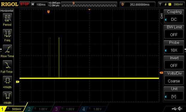Para estimar el consumo de energía de lo Attiny necesitamos saber cuando está trabajando. Para hacer cambiar ligeramente el código siempre enciende el LED verde justo después de que se despertó y de derecho antes de se va a dormir. Por supuesto los pulsos son manera de ayunar para ser sensible con el ojo desnudo, por lo que conectado mi osciloscopio para obtener los datos. Para obtener una acción más dentro del campo de visión se ha cambiado el LED tiempo fuera por 0,5 segundos.