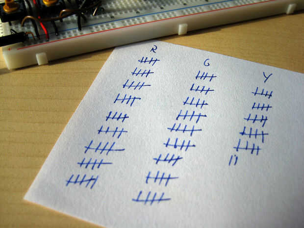 Incluso este leve no-aleatoriedad es sensible. Así sólo uso ruido 'al azar' como semilla (valor de inicio) de una función matemática 'al azar'. Yo he contado los acontecimientos individuales (ver lista arriba). El resultado más o menos coincide con la probabilidad de ajuste de 40% rojo, verde 40% y 20% amarillo.