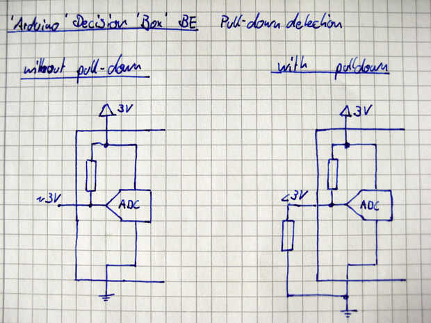 Si el pull-up interno y no externo hacia abajo utiliza la tensión en esa entrada deben estar muy cerca de la tensión del sistema. Si se usa un externo hacia abajo ambas resistencias crean un divisor del voltaje y así el voltaje en esa entrada debe ser significativamente inferior. Toda izquierda que era el ADC para leer el valor y se compara con el umbral preprogramado. Si el valor medido es inferior a un desplegable externo se utiliza para que una señal es alta activa.