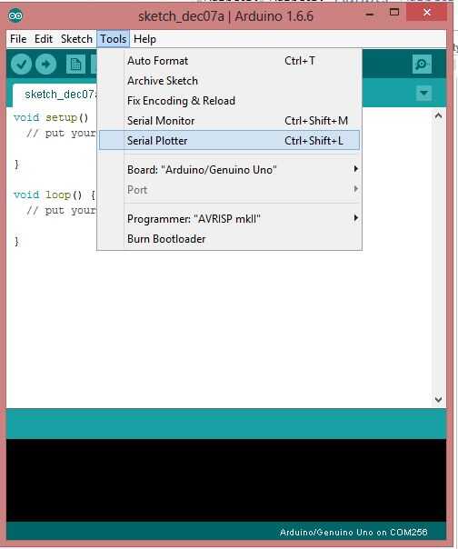 Una vez que el boceto se ha subido al Arduino, ir a por encima de la ruta de acceso para abrir el Serial Plotter.