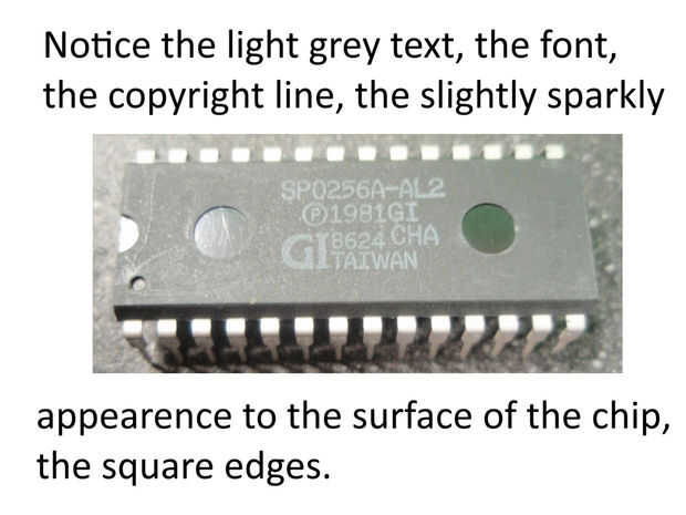 Buscando fichas de NOS (nuevo viejo Stock) en eBay, busque algunas cosas. Las imágenes muestran algunos chips no originales chips originales de vs, así que busque los. Los chips real deben tienen el logo GI en ellos, debe tiene la línea de derechos de autor y debe buscar viejos y como los de las fotos.