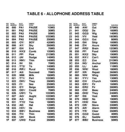 SPO256-AL2 tiene 59 "alófonos" en direcciones diferentes en el chip. Alófonos son los sonidos que forman palabras, por ejemplo, "TT UW (pausa) BB EE" en las palabras "To be". El microprocesador (un arduino, en este caso), selecciona el los alófonos correcta a través de un puerto de dirección de 6 bits en el chip para hacer una palabra y los envía uno a la vez a la SPO256-AL2, que entonces habla el allophone.