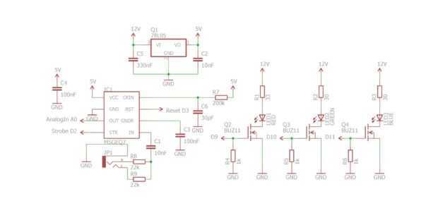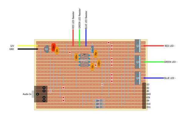 alegrar sus melodías favoritas con color flashing LEDs! Ultra brillante 5mm LED, rojo, azul y amarillo, responden al bajo, medio, y mostrar las frecuencias de agudos para una deslumbrante audio / visual.Verlo en acción aquí!Si usted quiere construir