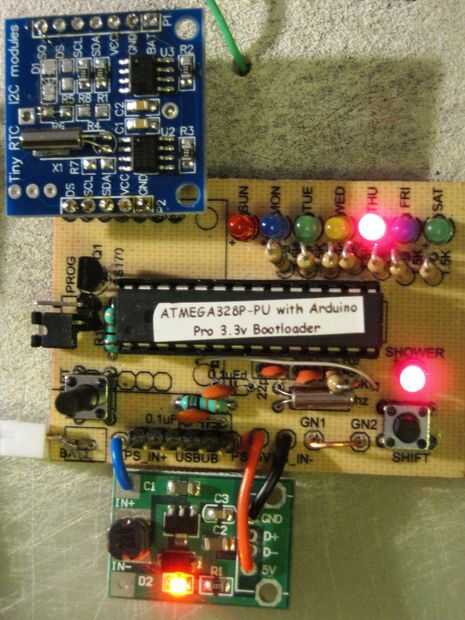 "ya que este perezoso Geek antiguo (LOG) está consiguiendo viejo, he(I) olvidar las cosas. Ahora me gusta a tomar una ducha todos los días pero no puede recordar si es día de ducha o no. Pude marcar en un calendario (papel o informático) o incluso podría tener el calendario de la alarma me pero por diversas razones, a veces quiero cambiar mi horario. Bueno, mi MD dijo que mi memoria estaba bien para mi edad, así que decidí hacer un pequeño Monitor de la ducha.