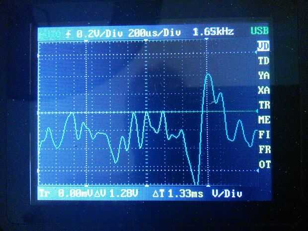 Por desgracia, mientras escribo esto, no tengo una guitarra para probar. Para evitar esto me improvisó un bote pequeño y había conectado a un ordenador portátil, jugar Pantera de acero. La imagen de ámbito superior es probablemente de la balada del amor romántico "Stripper Girl". A pesar de la imagen, que parece haber sido mala suerte, la salida está a unos pocos mV de 0V con un voltaje pico-pico de sobre 1V.