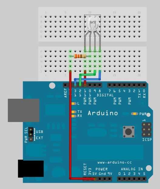 Primero Conecte una resistencia de 330 ohm entre el pin de 5v de Arduino y el rgb led del pin positivo. A continuación conecte el rojo pin a pin 11, verde 12 pin a pin, azul pin a pin 13. Entonces vaya al paso 5 para programar el Arduino.