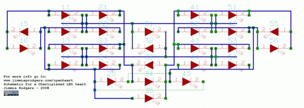 Aquí está el esquema visto desde la parte superior. Tienes que revisar que antes, durante y después de la construcción. Una vez construido, necesita probar completamente. Cada combinación de 2 cables a la batería deberá encenderse en una y sólo una, LED. Si 2 se enciende, entonces algo está mal. Habrá 3 combinaciones que no iluminan nada, así que no te preocupes y hacer una nota. Si más de 3 combinaciones no enciende, entonces probablemente tienes un corto o un LED frito.