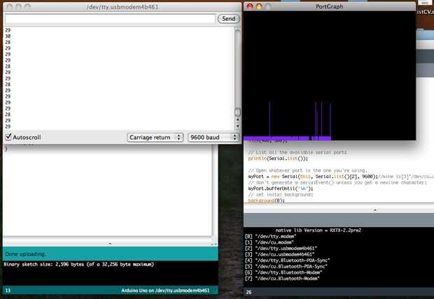 En este punto, deberías ver algo como lo que aparece en las imágenes en pantalla.  Tengo la serie ventana abierta en el IDE de Arduino en el fondo y el Applet de Java que proceso genera en el forground.  Si los valores en la ventana del serial son demasiado alta (digamos constantemente por encima de 150) o el gráfico se ve significativamente más morado que en la siguiente imagen, ajustar el potenciómetro hacia abajo para que el circuito no es recoger tanto "ruido" ambiental.