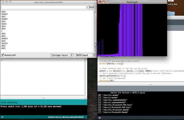 Experimentar con cargas estáticas. Use el peine en su pelo o piel de su perro a cargar para arriba, si es después cerca de la antena o el cable expuesto. Debería ver un punto en el gráfico y la ventana valores de serie (como en la imagen de abajo) ya que viene más cerca. (Se sorprenderá de cuán lejos puede detectar la carga!) Intente lo mismo con su globo, o con un trozo de celofán. Shuffle a través del suelo en sus calcetines y poner el dedo cerca de la antena. Tirar de una longitud de embalaje cinta del rodillo dentro de unos cuantos pies y pulgadas de la antena y ver qué pasa. Si tienes acceso a un generador VanDeGraff u otro aparato de descarga eléctrica jugar con él! Incluso es posible obtener una reacción de una mano de adhesivo o reloj brillan en la oscuridad. Este es un circuito bastante sensible!