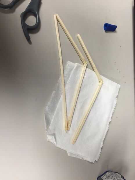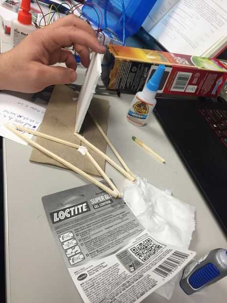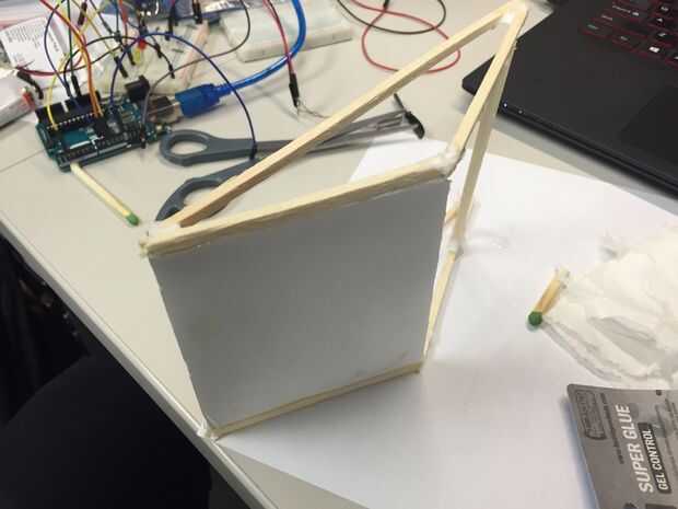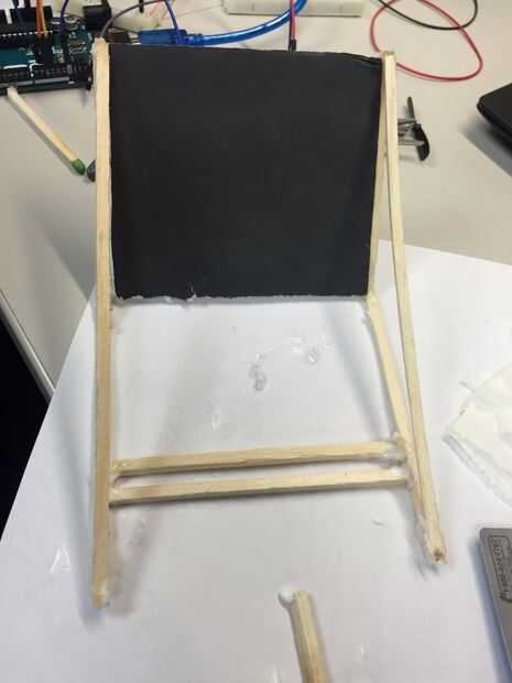 Necesitamos reparar los ventiladores en una posición frente a la toalla de papel húmeda. Para hacerlo más fácil y el dispositivo más elegante (: D), vamos a hacer un marco de madera. Después de pegar los palillos de madera, agregue un trozo de cartón pluma, hacer dos agujeros en él y fijar los motores dentro.