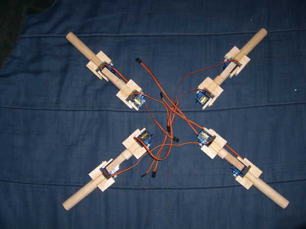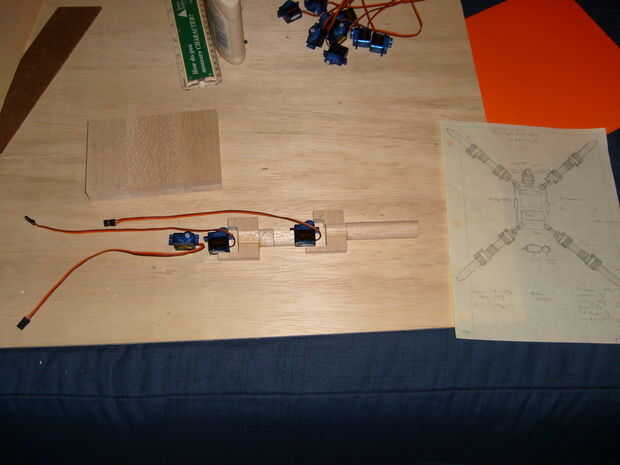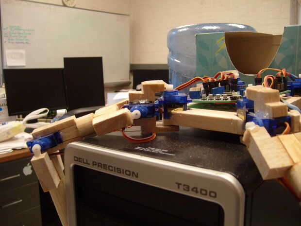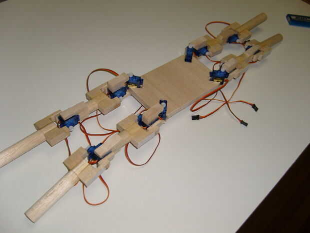 He añado una cansina de una pierna y varias fotos para que usted los puede utilizar para referirse a cuando usted está construyendo las piernas. Un detalle a destacar para las piernas es el punto de pivote. Se puede ver en mi modo que hay una aguja debajo del servo. Esto es para fortalecer la pierna, en lugar de tener todo el peso sobre el eje del servo. Esto es donde usted va necesitando el pedacito de taladro de 1/8 y 1/8 espiga. En cuanto a la barriga del robot, sólo un rectángulo con las muescas en las esquinas para sujetar los servos.