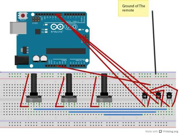 Obras remoto el helicóptero de una señal analógica desde el potenciómetro en los joysticks de la lectura. Si tuviéramos que conectar el transistor a la palanca de mando, el mando a distancia podría pensar que el joystick era moverlo. Arduino controla el transistor, a su vez controla el mando a distancia y que va a controlar el helicóptero.