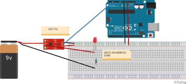 Para medición de corriente he utilizado un sensor de corriente efecto Hall ACS 712 (20 A). Hay sensor de gama ACS712 corriente diferentes disponibles en el mercado, así que escoge según su requisito. En el diagrama de tablero de pan he mostrado LED como una carga pero la carga real es diferente.