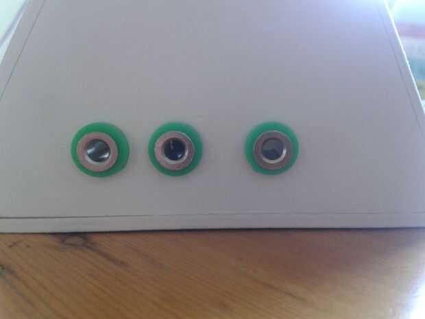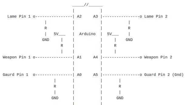 Las armas están conectadas a la caja mediante enchufes de banana de 4mm. Son espacios de 15mm y 20mm de separación. Estos se conectan directamente a pines analógicos de Arduino con tirar para arriba y tire hacia abajo de resistencias, según la imagen del circuito.
