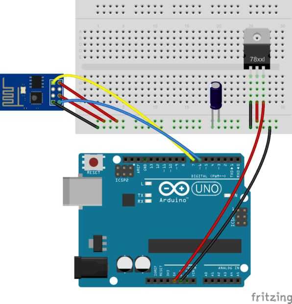 Entonces, cuando se trata de las conexiones de TX y RX, se debe evitar conectar el TX del Arduino directamente a la RX del módulo Esp ya podría dañar ambos, por lo que dos soluciones fáciles puede utilizar para resolver este problema. La primera es utilizar un simple divisor de tensión con resistencias (como en el diagrama anterior) para bajar el voltaje de 5V del Pin TX del Arduino a 3.3 V o puede utilizar una palanca de cambios de nivel con un diodo, ambas hacen el trabajo correctamente y es elegir uno para su proyecto.