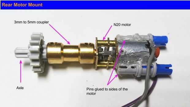 Para el montaje posterior del motor, he usado un motor N20 conectado a un eje de Lego usando 3mm al acoplador de 5mm como se muestra en la foto. LEGO los pernos estaban pegados a los lados del motor.