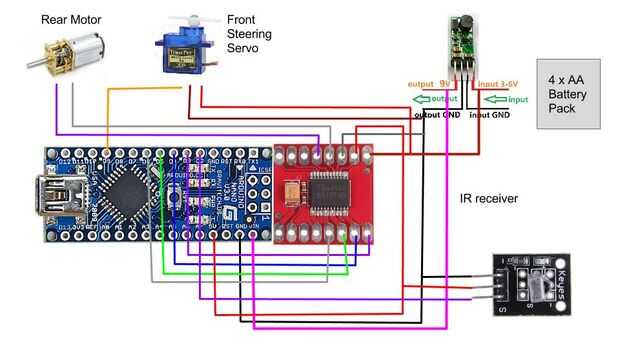 Alambre de todos los componentes según el esquema. Notarás que utilizo 9v convertidor elevador poder Nano a través del pin Vin. Esto elimina tener otra batería de 9V para la lógica. Motores todavía son alimentados por 6V. (Si usted quiere el coche para ir algo más rápido, puede conectar el Vcc para controlador de motor 9V terminal.)