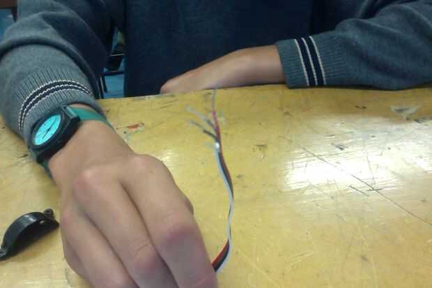 Entonces, usando cortadores o incluso las uñas si son largo suficiente, sacar 1 cm de goma de alrededor del alambre en cada extremo del alambre recubierto.
