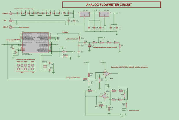 El microcontrolador: un bootloaded de atmega328p en Arduino genera 710kHz al circuito LC resonnant. La tensión de seno en C10/C11 (+-15V) es enviar a la A0 entrada analógica a través de un circuito de detección de envellop con un rectificador de divisor de tensión. Luego el microcontrolador mide la fluctuación de voltaje entre 2 hojas en poco tiempo y genera una PWM proporcional a este tiempo corto al convertidor PWM/4-20mA.