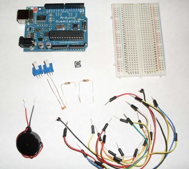 Todo lo que necesita, a excepción del zumbador piezoeléctrico y el jack mono, es en el juego "Arduino presupuesto Pack" de Adafruit Industries. Usé Radio Shack el piezoeléctrico y el jack mono.