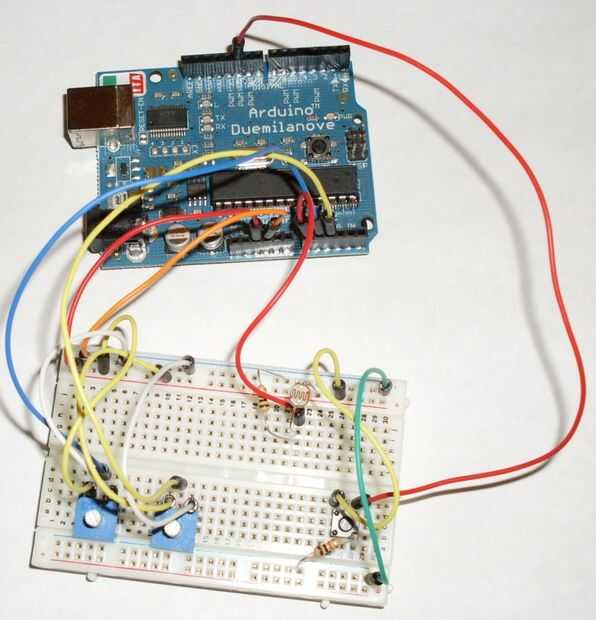 Si desea instalar un interruptor de la matanza, insertar el botón en su protoboard, ocupándose de orientación para asegurarse de que no corta el pasador de la muerte. Desea adjuntar para que une los hilos están en el mismo carril, y los hilos están en carriles separados. Conecte un cable al pin Digital 10 y el cable conectado a gnd mediante un resistor de 10kOhm. Conecte uno de los otros conductores a 5v. Este botón leerá bajo y abierto, alta mientras presiona.