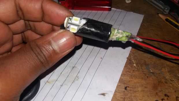 usando un 2 pulgadas pedazo de alambre más delgado (calibre 20-22) hacer un pequeño anillo (lo suficientemente pequeño para calibre 16) y tuerza el alambre restante en una cola. y pegamento caliente en el tubo más pequeño detrás del led.