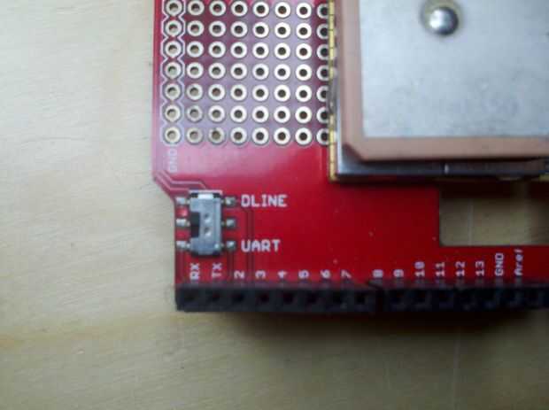 Para trabajar con mi código, asegúrese de que el pequeño selector está en "DLINE" en la pantalla del GPS. (Incluido un cierre para arriba si no tienes idea lo que estoy hablando) Esto es para que podamos usar los pines 2 y 3 para comunicarse con el GPS en vez de la configuración "UART", que utiliza los pines 0 y 1. Esto es una preferencia personal, modificar el código. Si se usa el UART, haga pasar a DLINE durante la carga de código para el Arduino si se une el escudo.