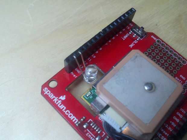 El led está en el pin 13 (véase cerca hacia arriba de la foto). Este parpadeará cada vez que registra un punto GPS.