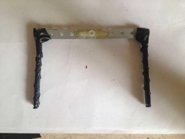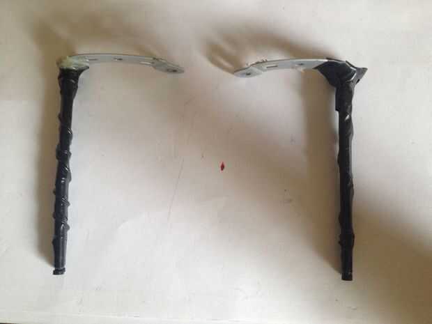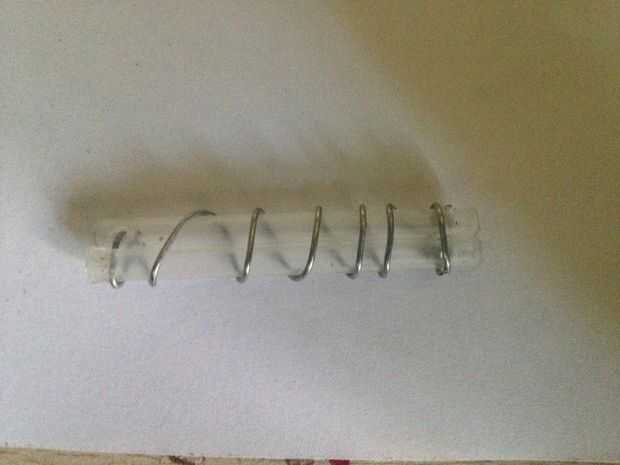 Empieza por tomar 2 tubos de relleno de pluma y hacer agujeros a través de ellos. Aquí es donde el alambre de metal se atraviesan y mantenerlos juntos para dar un fuerte apoyo para las piernas.