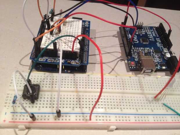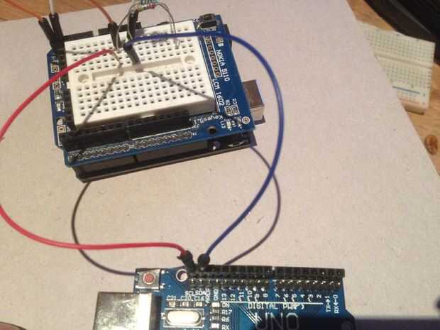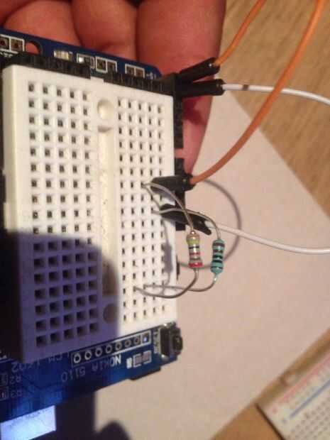 En segundo lugar, conectar el punto de encuentro de las dos resistencias a los + 5v de las dos Arduinos y conectar la tierra del Arduino dos juntos. Esta manera no solo compartir comunicación pero comparten el poder.