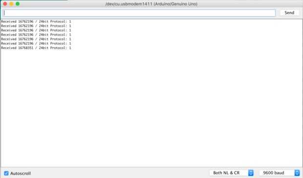 Ahora, cuando usted presiona un botón en el control remoto, ver la señal que aparece en el monitor serial! Observe que cada botón (en la A, de A, B, B etc.) tiene su propia señal. Anote estas señales porque los utilizaremos más adelante.