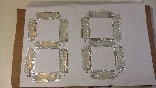 Cada segmento tiene dos LED en oposición extremos del segmento. Los LEDs le están dobladas en un ángulo de 90 grados y hacia el interior del segmento. Corte o algunos agujeros de insectos para tu LED. NO PERMITA QUE LOS CONDUCTORES DEL LED A ENTRAR EN CONTACTO CON EL PAPEL DE ALUMINIO. Papel de aluminio es un conductor, por lo que se corta a los LEDs. Después de tener el LED colocado correctamente, es hora de poner el pegamento caliente. Usted quiere pegamento caliente que encima de la bombilla LED y entre los LEDs, efectivamente, conectar los LEDs. El pegamento caliente difunde la luz a lo largo del segmento entero.