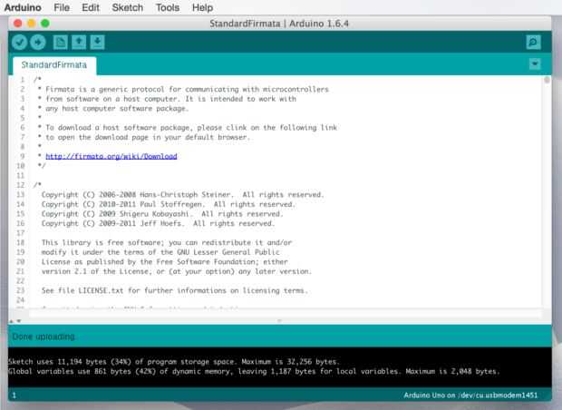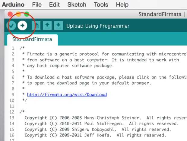 Ahora estamos listos para subir una estándar firmado a Arduino.