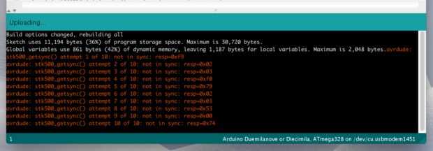 A continuación, obtendrá una serie de mensajes de error "no sincronizado" (como se ve en la segunda foto). Esto casi siempre es porque usted ha elegido la placa Arduino mal. Ir a las herramientas--> elemento de menú de tablero y verificar que tu placa Arduino coincide con el elemento de menú elegido. Haga clic en el botón de "Upload" otra vez.