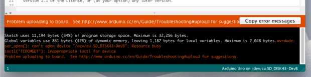 En primer lugar, Si obtienes el mensaje "Problema subir a Junta" (como se ve en la foto primera de arriba), esto generalmente indica que usted ha elegido el puerto USB malo. Ir a las herramientas--> elemento de menú de puerto y ver si hay un puerto USB diferente que puedes probar. Haga clic en el botón "Subir".