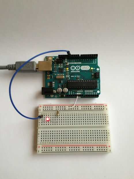 Para una más completa prueba, conectar un LED con una resistencia a uno de los puertos. Como se ve en la foto primera de arriba, nos hemos conectado dos cables de la Arduino a un protoboard. El primer cable viene desde el conector de tierra (GND) de Arduino. Este cable se conecta a un resistor de 100 ohm (cualquier resistencia entre 100 y 330 ohmios debería funcionar), que a su vez está conectado a la pata corta de un LED rojo. Por último, la larga pierna de LED está conectada con el cable azul que se conecta al pin 12 de Arduino (pueden utilizar cualquiera de los pines de salida digital 2 a 13).
