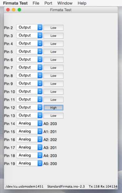 Una prueba rápida puede hacerse mediante la aplicación de prueba de una firmado. Puede descargar la aplicación desde la Página principal de una firmado. Desplácese por la página para encontrar la aplicación de prueba y descargar la versión adecuada para tu máquina de escritorio y sistema operativo. Una vez que la aplicación en ejecución, utilice el elemento de menú de puerto para elegir el puerto USB correcto. La aplicación de prueba debe reportar todos los puertos analógicos y digitales disponibles para tu Arduino, como se muestra en la segunda foto de arriba.