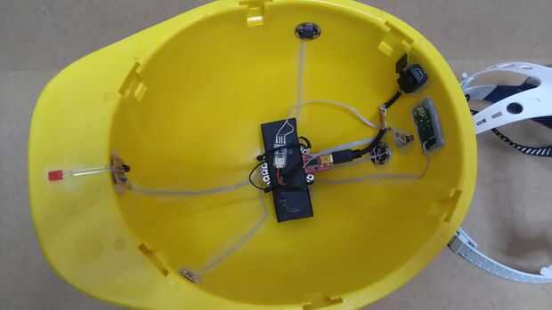 - Si la temperatura del ambiente se convierte en superior al cuerpo del trabajador puede soportar (por ejemplo, 45 º c), el casco le informará con un sonido de advertencia (diferente) del zumbador. Si el ambiente es muy ruidoso, sabrá que él está en peligro de rojo parpadeante led en la parte delantera del casco.