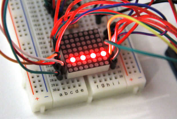 Esto se denomina multiplexación. A pesar de que parece que estamos iluminando muchas filas de LEDs al mismo tiempo, sabemos que realmente estamos iluminación cada fila uno por uno, pero lo estamos haciendo tan rápido que nos hemos engañado los ojos pensando que todo está sucediendo al mismo tiempo. Multiplexación es útil cualquier momento quieren controlar muchas cosas con pocos pines. En vez de conectar cada LED individual, podemos multiplexarles y reducir los costos y problemas significativamente.