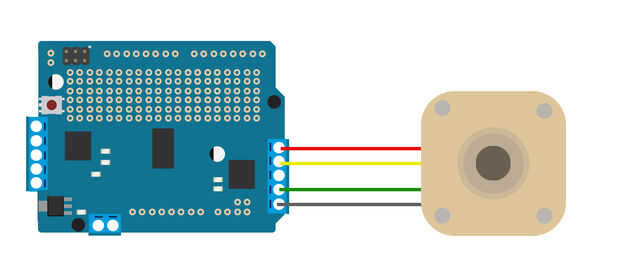 El motor de paso tiene dos conjuntos de GND y VCC. Cuenta con total de 4 cables. Por favor, siga el diagrama de conexión y conectar el motor de paso al escudo del motor mediante puente de alambre.