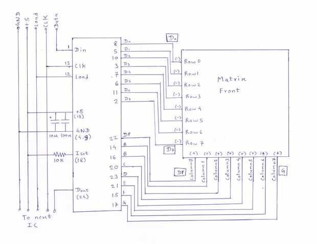 - DIG0, DIG1, DIG2.... DIG7 - son pins - ve. Están conectadas a cathodes(-ve) de los LEDs. Estos pines se conecta a las filas de la matriz.